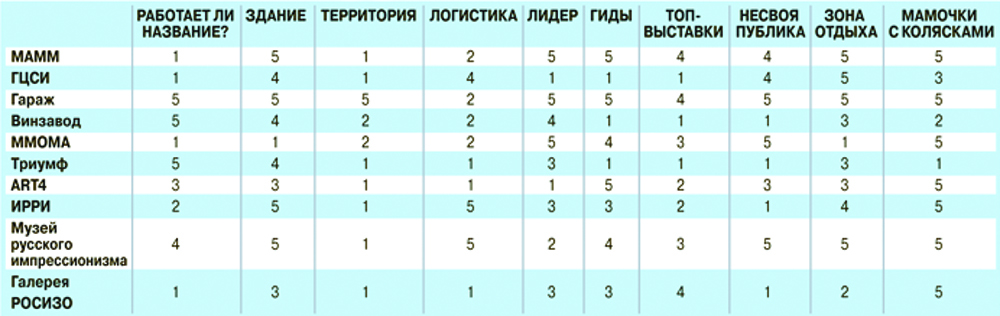 Берем десять основных современных галерей и помещаем их в табличку — под десятью вышеприведенными «приманками». Оцениваем (с помощью наших респондентов) каждый пункт по пятибалльной шкале. Насколько он работает для потенциальной (не узкоспециальной!) аудитории: эффективно ли название, хорошо ли подается фасад здания...