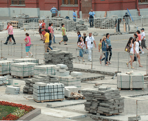 Одним из немногих мест в Москве, где на сегодняшний день ведется укладка плитки, оказалась улица Никольская, которую сделали пешеходной. Там укладывают особую гранитную плитку, разноцветную, согласованную с архитекторами и Москомнаследием. Рабочие сначала снимают верхний слой асфальта (15—20 см), затем засыпают песок и кладут саму плитку. Затем по сложенным плитам ударяют специальными инструментами, чтобы поверхность была ровной. Зазоры между плитками заметают смесью песка и цемента. Кроме того, построены водоотводы, по которым уходит дождевая вода. Работяги сообщили, что они строго соблюдают технологию укладки. Дождь, начавшийся как раз во время нашего разговора, тоже не стал помехой. Старшего на месте не оказалось, но плиточники утверждают, что за выполнением плана тщательно следят.