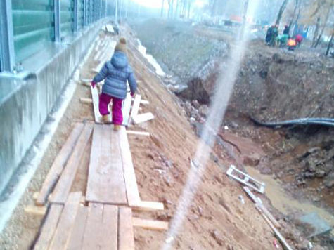 Чтобы пересечь дорожное полотно, жители используют узкую тропу из бетонных плит. Она покрыта грязью, поэтому местные специально ходят здесь в сапогах, а с собой таскают сменку. Тропа ведет от жилых домов и упирается в разрыв шумозащитного барьера, вдоль которого приходится идти по деревянному настилу с хлипкими, сколоченными на скорую руку перильцами. А дальше пешком по проезжей части. По ней, кстати, и сейчас снуют грузовики строителей и тяжелая землеройная техника.