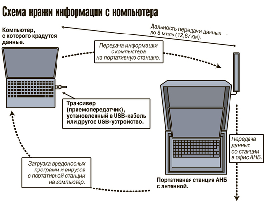 Суть его в случае с компьютерами крайне проста — в USB-кабель или USB-устройство специалисты встраивают крохотный трансивер (приемопередатчик). После того как кабель или устройство, в котором находится трансивер, подсоединяется к компьютеру владельца, информация с него становится доступна для АНБ. Она передается на секретных радиочастотах на портативную станцию АНБ. Дальность передачи данных составляет порядка 8 миль (почти 13 км). Более того, с портативной станции агент может отослать при помощи радиосигнала на атакуемый компьютер вирусы или другие вредоносные данные и вывести его из строя.