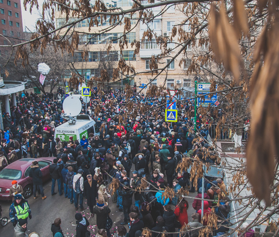 К 13:00.на улице уже около 1000 человек. Пятачок на пересечении Татарской улицы и Большого Татарского переулка полностью занят людьми. Скандируют "Свободу!".