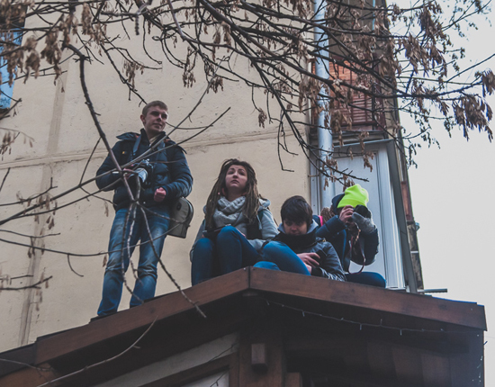 На улице - по-прежнему около 1000 человек. Костяк стоит вплотную к заграждениям. Развевается флаг России. На крышах автозаков - силовики. Молодые оппозиционеры забрались на крыльцо упоминавшейся ранее хинкальной - оттуда открывается прекрасный вид. На мостовой - мусор, люди стоят с плакатами, много граждан в майках с именами обвиняемых.