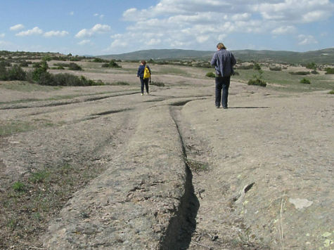 Мы наткнулись на большие поля, испещренные их следами. Расстояние между двумя соседними углублениями от колес везде одинаковое, и оно соответствует колее нынешних легковых автомобилей. Максимальная глубина колей достигает одного метра. На боковых стенках в самых глубоких местах видны горизонтальные царапины. Очень похоже, что они оставлены выступающими концами осей, на которых крепились колеса древних средств передвижения.