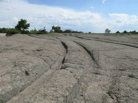 Как я предполагаю, эти колесные экипажи ехали по какой-то податливой в ту пору поверхности и продавили в ней своим весом глубокие колеи, а потом эта поверхность постепенно окаменела, сохранив до наших дней все отпечатки. Подобные случаи известны геологам: есть, скажем, примеры естественной консервации следов динозавров.