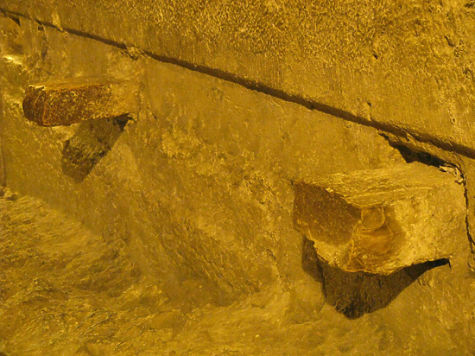 Еще одно важное наблюдение я сделал, побывав не так давно в недрах тоннеля Котеля, находящегося под Храмовой горой в Иерусалиме, и обследовав часть скрывающихся в глубине его очень древних подземелий с сохранившимися там огромными мегалитическими блоками. Кое-где в них оказались «впаяны» куски окаменелого дерева — применявшихся при первоначальном строительстве брусьев и досок.