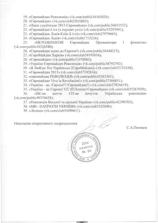 К посту он приложил запрос из ФСБ от 13 декабря 2013 года, сообщает computerra.ru, в котором перечисляется 39 сообществ: