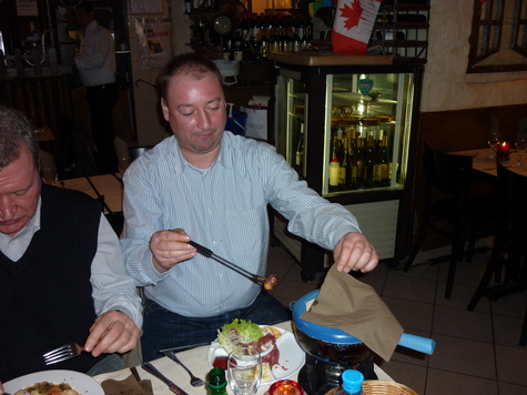 Еще через полчаса официант торжественно ставит передо мной газовую горелку и приносит какие-то раздвоенные по концам шампуры. «Фондю» почти готов», - поясняет он. Мне уже не особо хочется есть, неловко задерживать соседей по столу, которые ждут меня. Но они стойко заказывают новые порции своих блюд.