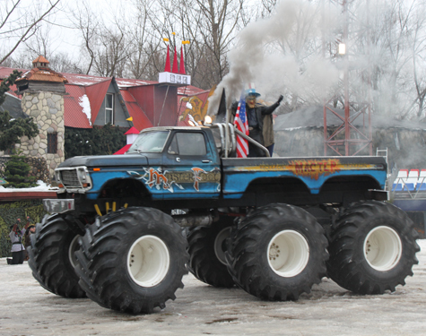 И понеслась на Сетуньском Стане сказочная история с огнем, трюками, дивной техникой. На полигоне каскадеры задействовали 12 единиц техники, среди которых два раритета — танк «Т-3» (его в самом начале войны использовали) и «Биг-фут» — машина на колесах диаметром в два метра. Если кто рядом стоит, карликом на фоне таких колес смотрится. Прикатили пираты — естественно, Карибского моря, елку с Дедом Морозом скрутили, чтобы она в Кремль не попала, но тут наряд подмосковной ДПС подоспел и вступил в схватку с носителем зла — проклятым американским империализмом в лице старика Шелла Петролеума.