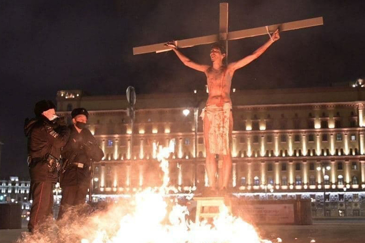 Бывший студент МГИМО Павел Крисевич появился на Лубянской площади в образе Христа, привязал себя к импровизированному распятию, у подножия которого лежали кипы папок под названиями «Дело сестёр Хачатурян» и «Дело Бориса Немцова». После чего группа единомышленников подожгла бумаги с помощью специального средства, которое горит при температуре 40 градусов и не может причинить вреда человеку.