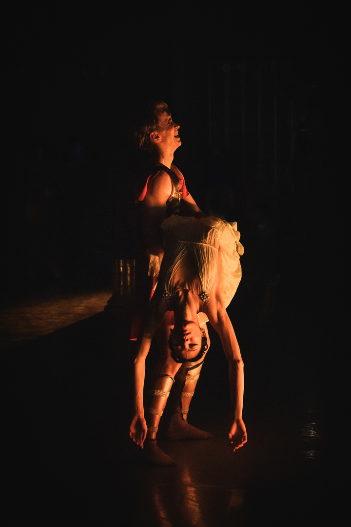 В балете хореограф выстраивает сложнейшие ансамбли. Например, приехавших на обручение главных героев, финикийского царя Эшвбала и царицы Финикии Зивар и их свиты (три пары танцовщиков). Или насыщенных прыжками и вызывающие в памяти пиррические пляски древних греков перед битвой, танцы воинов Луция в белых хитонах и серебряных доспехах, с другом Луция Асканием во главе (Артем Мишаков и Александр Таранов).