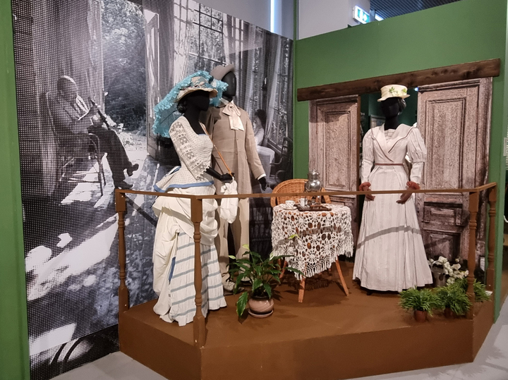 Выставка оформлена в виде летней усадьбы. Здесь собраны видеоматериалы, фотографии, эскизы декораций и костюмы, знакомые всем любителям кино, — из таких фильмов, как «Дворянское гнездо» и «Дядя Ваня» Андрея Кончаловского, «Неоконченная пьеса для механического пианино» и «Несколько дней из жизни Обломова» Никиты Михалкова, «Жестокий романс» Эльдара Рязанова и других. В качестве экспоната присутствуют, например, костюмные комплекты к фильму «Анна Каренина», который снял Сергей Соловьев в 2009 году…