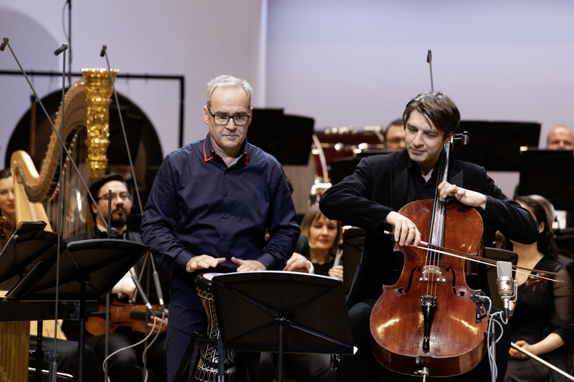 Шутки шутками, а завершился концерт настоящим чеховским выстрелом из ружья — российской премьерой Двойного концерта для виолончели и перкуссии с оркестром сербского композитора и перкуссиониста-виртуоза Небойши Йована Живковича, солировал сам автор вместе с виолончелистом Иваном Сендецким. Мощный полифонический полилог оркестра, виолончели и разнообразных ударных. У каждого из участников «беседы» — своя линия, своя правда. Нервные ударные, которые сами по себе привлекают внимание — и положением на сцене справа от дирижера, и ярким контрастом с оркестром. Вторая часть — сказочная за счет тембра вибрафона, но настоящая балканская сказка развернулась в бурном и ярком финале «Безумный хоровод».