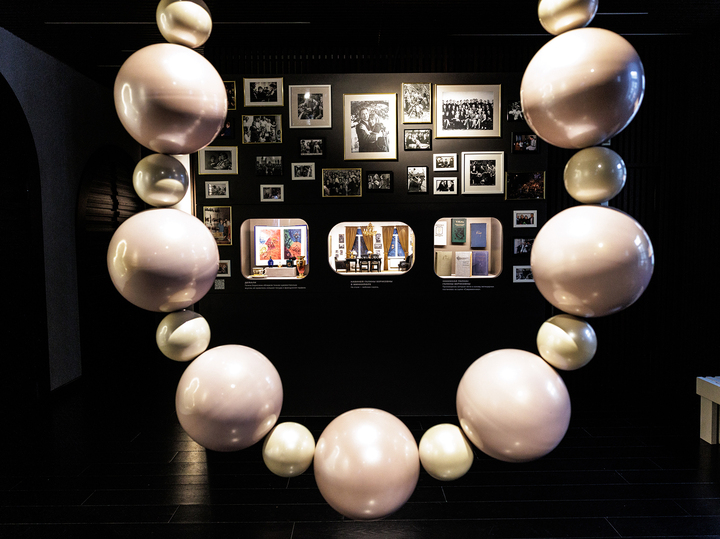 В кулуаре Галины Волчек в центре выставочного пространства - огромные бусы, напоминающие историю ухода Олега Ефремова во МХАТ. Тогда Галина Волчек стала главным режиссером - труппа так единогласно решила.  В планы ведущей актрисы театра, имевшей на своём счёту несколько спектаклей, это не входило, но деваться было не куда: так решила труппа. Она расплакалась, понимая, что с актёрской профессией придётся попрощаться. Как-то на одном из приёмов она рассказала своей  коллеге о переживаниях, и та то ли в шутку, то ли в серьез заметила, что теперь Волчек придётся ходить в джинсах и свитерах. Галина Борисовна рассмеялась, но дала себе клятву, что этого никогда не случится. Она решила, что на каждую премьеру непременно будет надевать новое красивое платье и сохранять свой стиль -  элегантный. И она сдержала это обещание: на каждую   премьеру  приходила в  тщательно подобранных нарядах и украшениях.