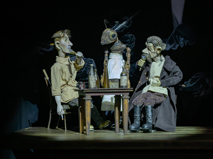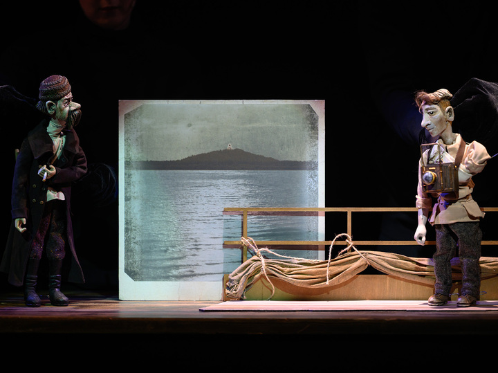 Художник-постановщик Мария Кривцова создала не только декорации, полутемное пространство, напоминающее фотоателье, но и кукол, с которыми работают не за ширмой, а непосредственно на сцене молодые актеры Московского детского театра марионеток Дмитрий Половников и Любовь Савичева.
