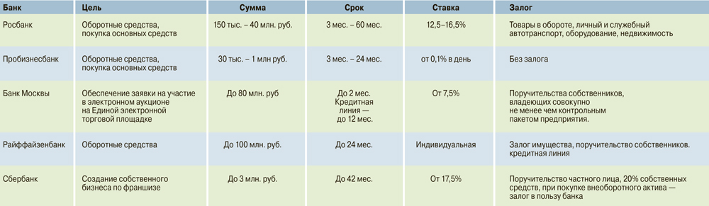«Микрофинансовые кредиты малому бизнесу мы предоставляем на суммы до 150 000 руб. всего за один час и по одному документу — паспорту владельца бизнеса. При этом не требуется залог или поручительство клиента. Кредит предоставляется после беседы с владельцем бизнеса. Ставка по таким кредитам составляет от 0,1% в день, а средний срок жизни — 18 месяцев», — приводит пример оперативности управляющий директор Пробизнесбанка по малому бизнесу Роман Гаврилов. Суммы до 1 млн. руб. предоставляются без залога и за один день, а большие суммы могут быть частично обеспеченными, их предоставление занимает до трех дней.