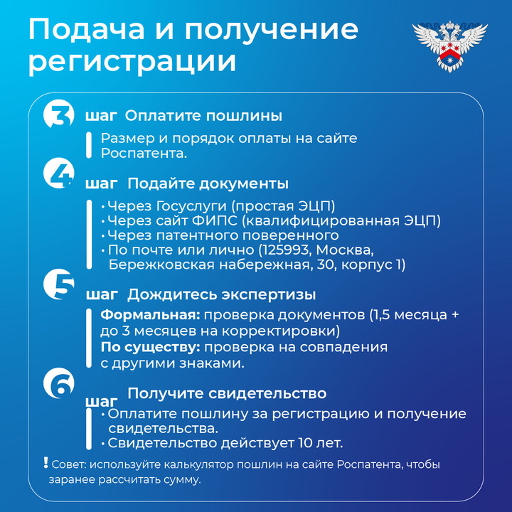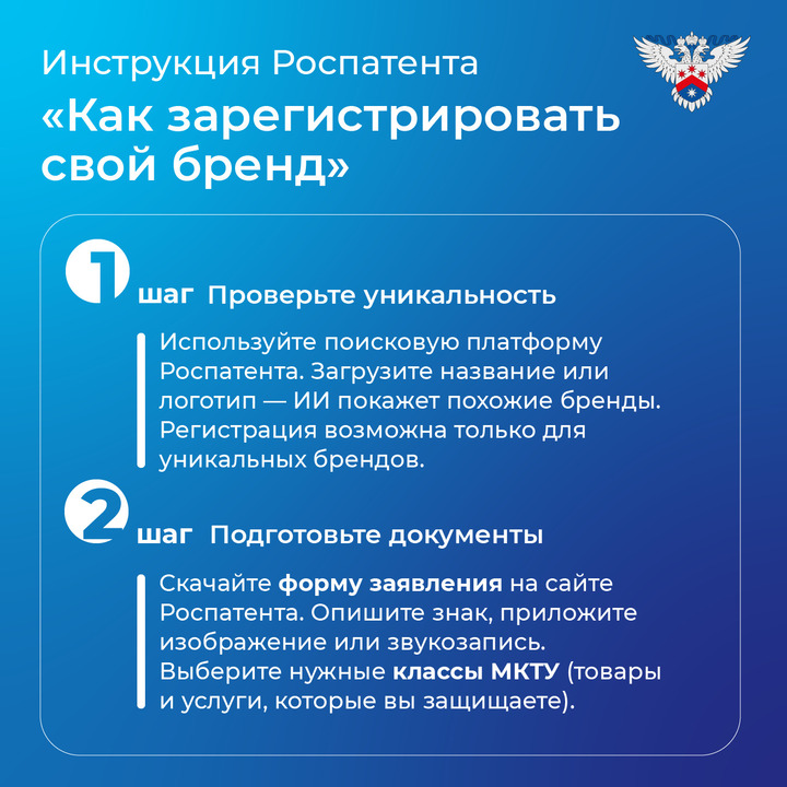 Для всех, кто хочет официально закрепить права на бренд, Роспатент подготовил подробный алгоритм действий.