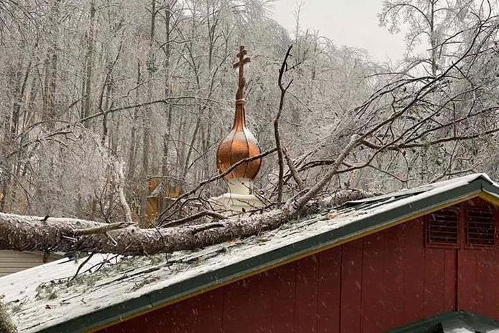По его словам, обледеневшие деревья упали на два здания обители, одно из которых пробило крышу над алтарем. Один из монастрыских фургонов был полностью раздавлен деревом.