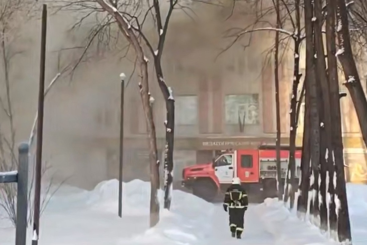 В Новосибирске загорелось здание педагогического колледжа №1. Очаг вспыхнул на третьем этаже и пробился к кровле, студентов спешно выводят на улицу.