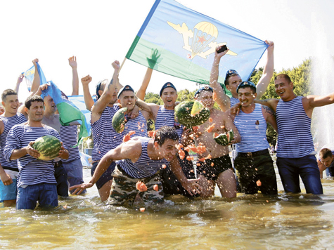 Уже днем десантники начали, как обычно, стягиваться в парк Горького. Традиционные купания в фонтане начались около 12.00. Под крики «Слава ВДВ!» одновременно в фонтан бросились более 30 человек. Всего к двум часам дня в парке было около 300 «голубых беретов», и особых проблем они не доставляли. Впрочем, сотрудники полиции, дежурившие здесь, признавались, что основные проблемы могут начаться вечером.