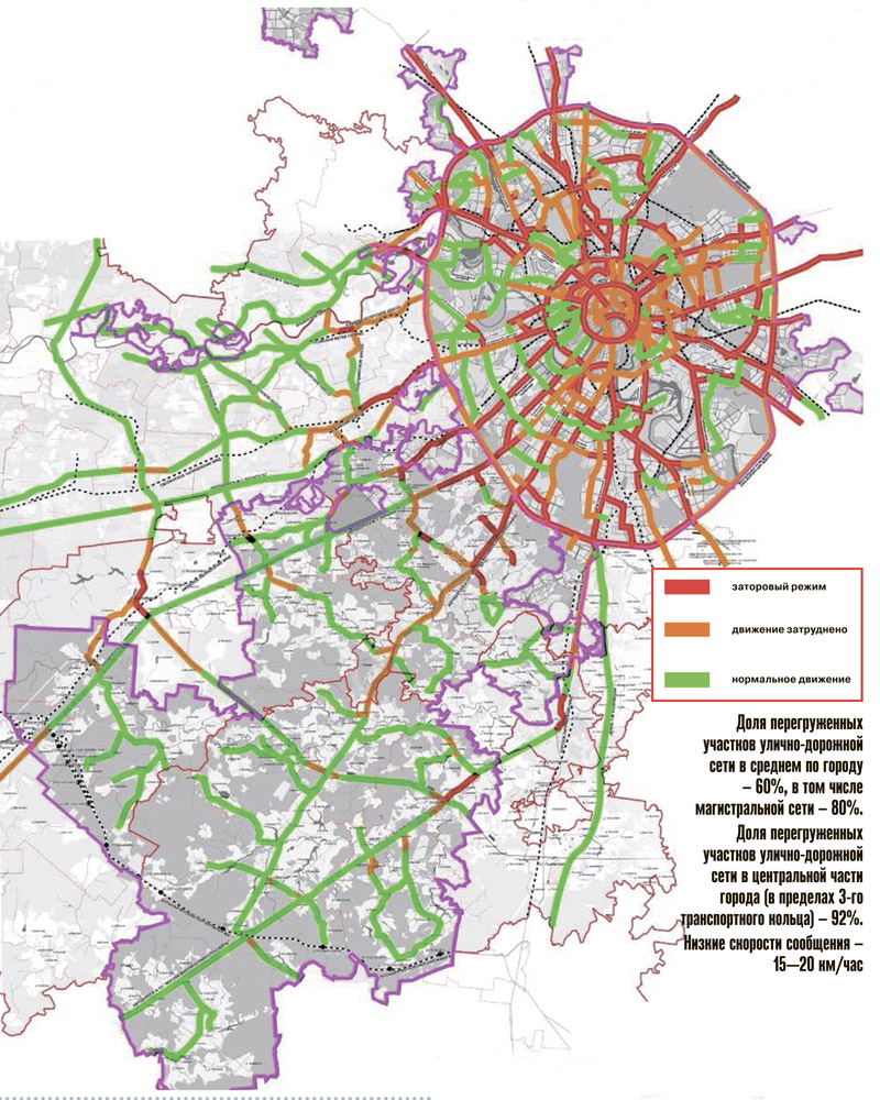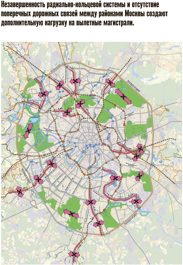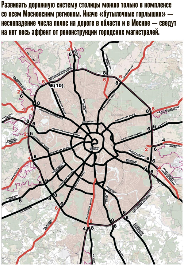 К тому же автомобилизация растет не только в Москве, но и в соседней области. Причем еще более сумасшедшими темпами. Значительная часть этих автомобилей ежедневно устремляется в Москву. По восточным и юго-восточным направлениям загрузка магистралей в часы пик составляет более 120%. С 8 до 9 утра МКАД пересекают 184 тыс. и 195 тыс. человек соответственно при пропускной способности 163 тыс. и 130 тыс. пассажиров в час. Загрузка остальных направлений находится на уровне 100–120%, и только Волоколамское и Ленинградское шоссе пока не исчерпали свои проектные мощности. По ним в Москву приезжают 74 тыс. и 68 тыс. человек в час при пропускной способности 96 тыс. и 69 тыс. Впрочем, уже через 5 лет и этой «лазейки» у водителей не останется. Всего на работу в Москву из Московской области ежедневно приезжает 1,3 млн человек, что дополнительно усугубляет имеющийся дисбаланс районов проживания и мест приложения труда. Можно без преувеличения сказать, что дальнейшее развитие Москвы означает развитие ее дорог.