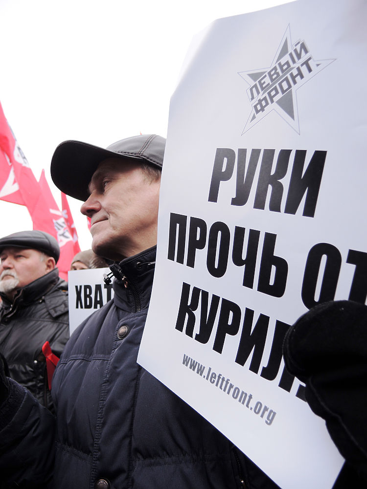 На Суворовской площади в Москве прошел согласованный митинг против передачи Курильских островов в состав Японии. Организаторы настаивают, что вопрос должен решаться на референдуме. По некоторым оценкам, около 2 тыс человек. Демонстрацию снимали японские журналисты.