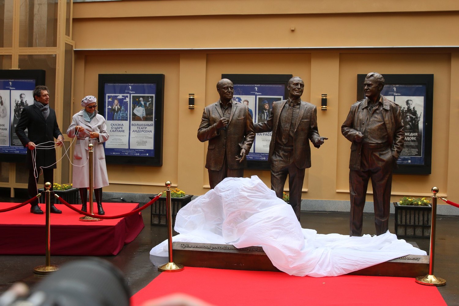 Театр имени Вахтангова начал свой 102-й сезон с открытия памятника. Возле Симоновской сцены на Старом Арбате установили монумент великим актерам Владимиру Этушу, Юрию Яковлеву и Василию Лановому.