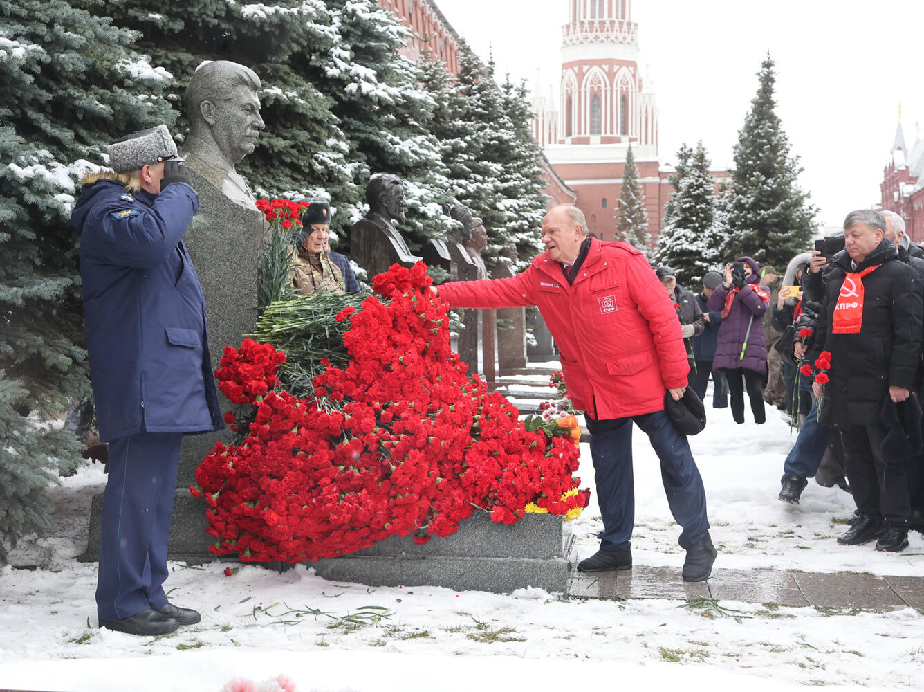 Колонну под красными знаменами возглавил лидер КПРФ Геннадий Зюганов. По завершении церемонии, политик поздравил всех с этим событием. Он подчеркнул, что России «крупно повезло», так как «практически в одном десятилетии родились Ленин и Сталин, которые, по сути дела спасли российскую государственность».