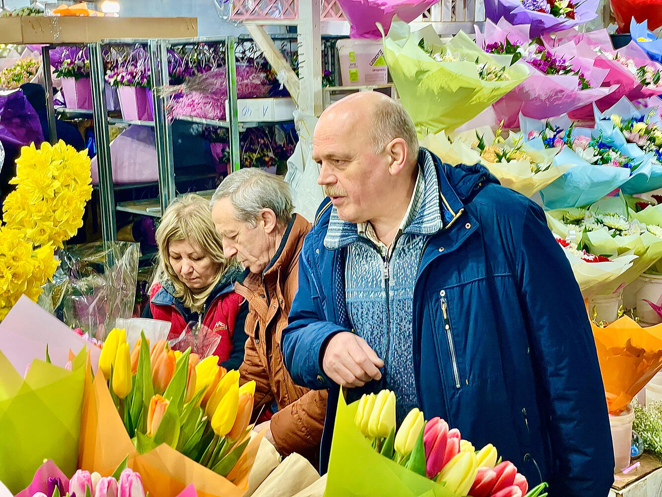 В преддверии Международного женского дня сотни (если не тысячи) москвичей устремились на Рижский рынок, чтобы по традции купить цветы для жен, мам и бабушек. Многие покупают букеты "оптом", целыми коробками - для коллег по работе. Большие очереди наблюдались уже ранним утром в четверг. Самыми популярными у мужчин оказались не только тюльпаны, но и отечественные розы.