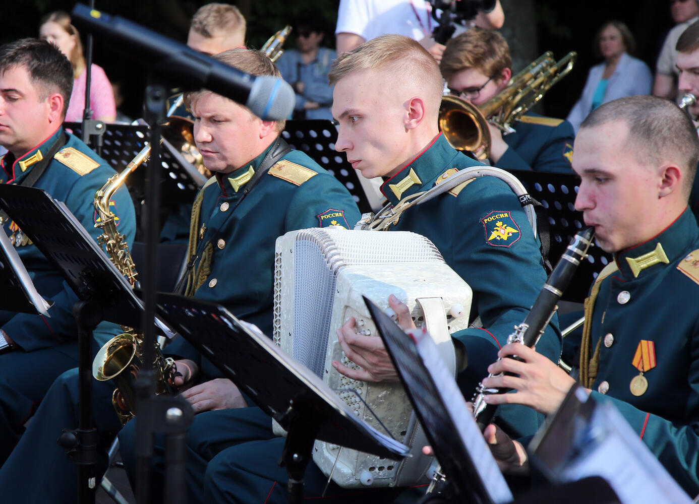 В субботу в парке "Фили" выступил ведущий творческий коллектив Алабинского военного гарнизона — Сводный военный оркестр 100-го Отдельного полка обеспечения и 15-го гвардейского мотострелкового Шавлинского ордена Ленина Краснознамённого полка гвардейской Таманской дивизии. Они представили свою летнюю программу для гостей парка.