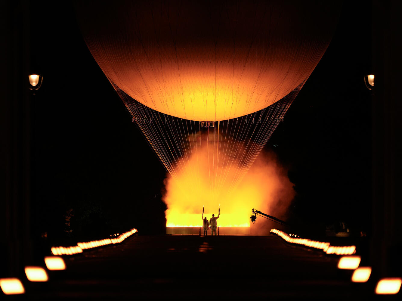 Факел с олимпийским огнем также доставили на центральную площадку церемонии необычным образом - часть эстафеты прошла по крышам Парижа, а вместо традиционной чаши Мари-Жозе Перек и Тедди Ринер подожгли корзину воздушного шара, который взлетел в небо над французской столицей.