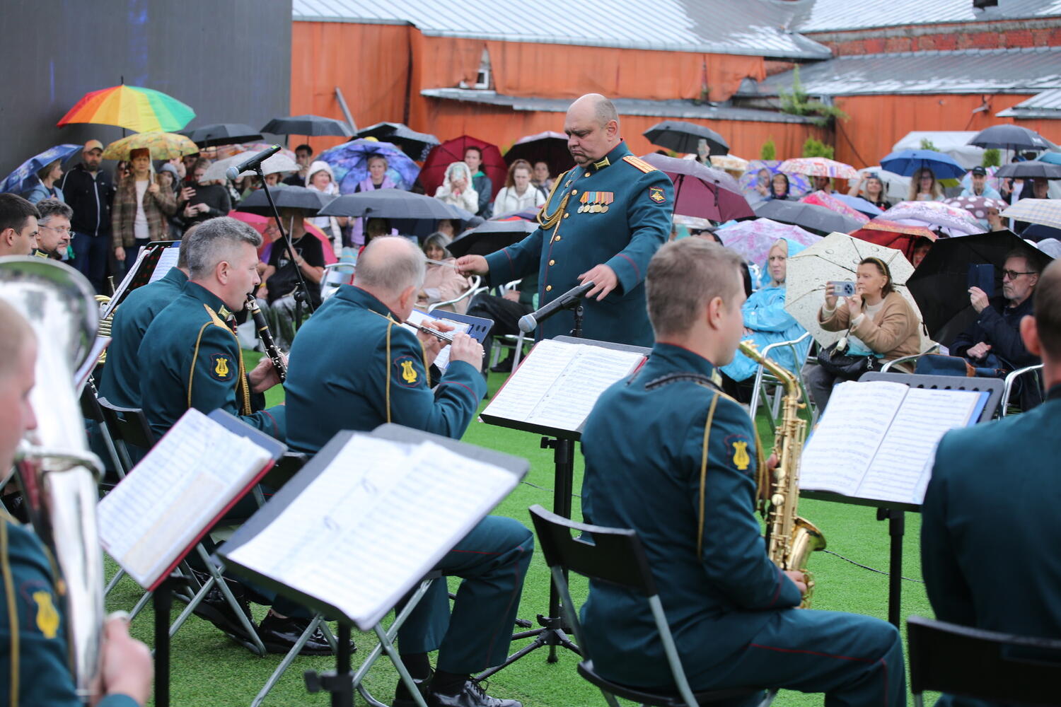Каждый год в июне месяце военные оркестры выступают в различных парках Москвы под открытым небом. В этом году, практически все выступления, прошли под дождём, но это не смутило ни солистов оркестра, ни слушателей. Заключительный концерт состоялся под ливнем.