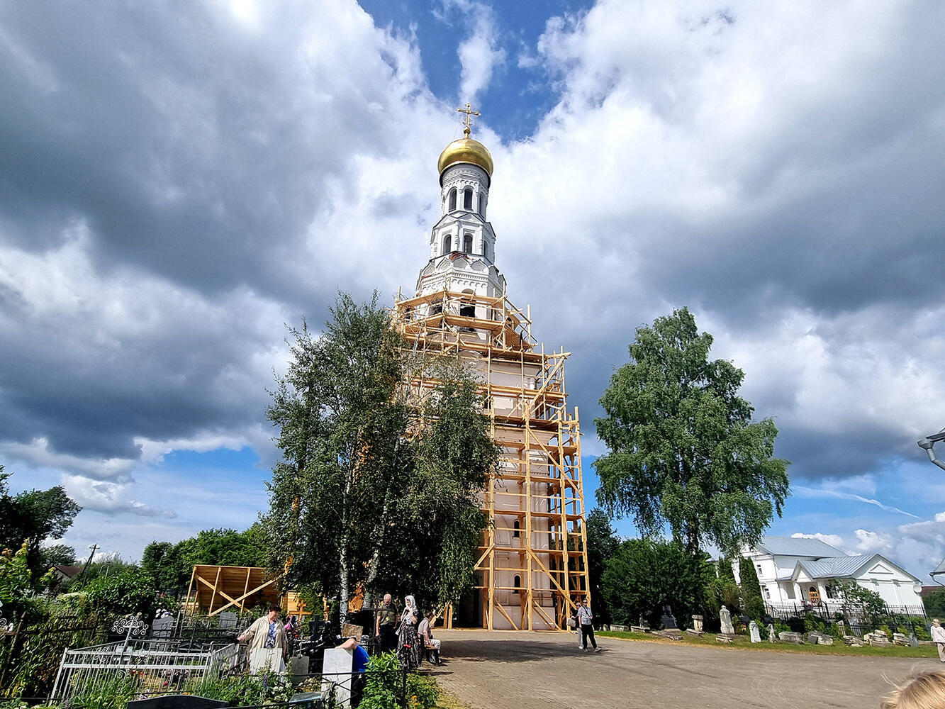 Рядом с Успенским храмом располагается Троицкий (Церковь Троицы Живоначальной). Впервые он был упомянут все в той же Писцовой книге 1623-1624 гг. как «церковь древяна вверх Архангела Михаила стоит без пения…». На месте старой Михаило-Архангельской церкви, которая была утрачена, в 1787 году был сооружен новый летний храм. В конце 1880-х годов церковь переосвятили во имя Пресвятой Троицы. В советское время церковь была закрыта, что традиционно для того времени. Сначала в ней хранили зерно, а в 1970-е годы устроили стеклодувный цех для изготовления елочных новогодних игрушек. К 1990-м годам церковь была возвращена верующим, но на тот момент она находилась в удручающем состоянии. После ремонта в 2004 году церковь была заново освящена. Сейчас храм работает и радует прихожан своей великолепной архитектурой.  В интерьере Троицкой церкви частично уцелели росписи XIX века, а также пол из чугунных плит первой половины того же века.