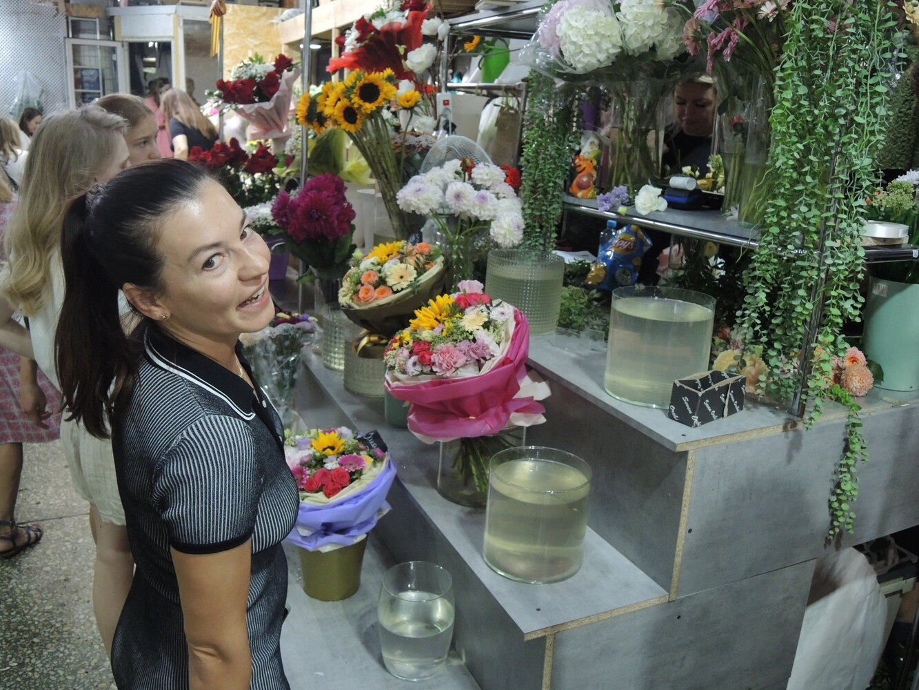 Множество москвичей собралось на цветочном рынке, чтобы приобрести букеты ко Дню знаний. В основном покупают розы, хризантемы и георгины. Но в этом году главные хиты сезона — подсолнухи. Связку из пяти штук продают за 700 рублей, но чаще всего их берут в букетах или «корзинках».
