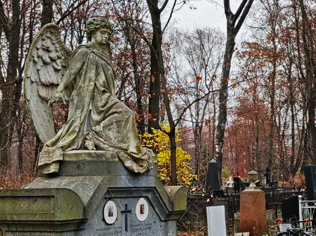 Хмурая осень окутывает Введенское кладбище тишиной, особой, звенящей и торжественной. Воздух, холодный и влажный, пропитан запахом прелых листьев и старого камня. Но даже в это угасание здесь есть жизнь. Рыжие белки, словно ожившие искры ушедшего лета, стремительно перебегают с плиты на плиту, замирая на мгновение с орехом в лапках. Их суетливость лишь подчеркивает общее спокойствие. Изредка тишину прорезает пересвист синиц и воробьев, их стайки оживляют склепы и ограды, напоминая, что это место — не только для вечного сна, но и для тихой, неприметной жизни.