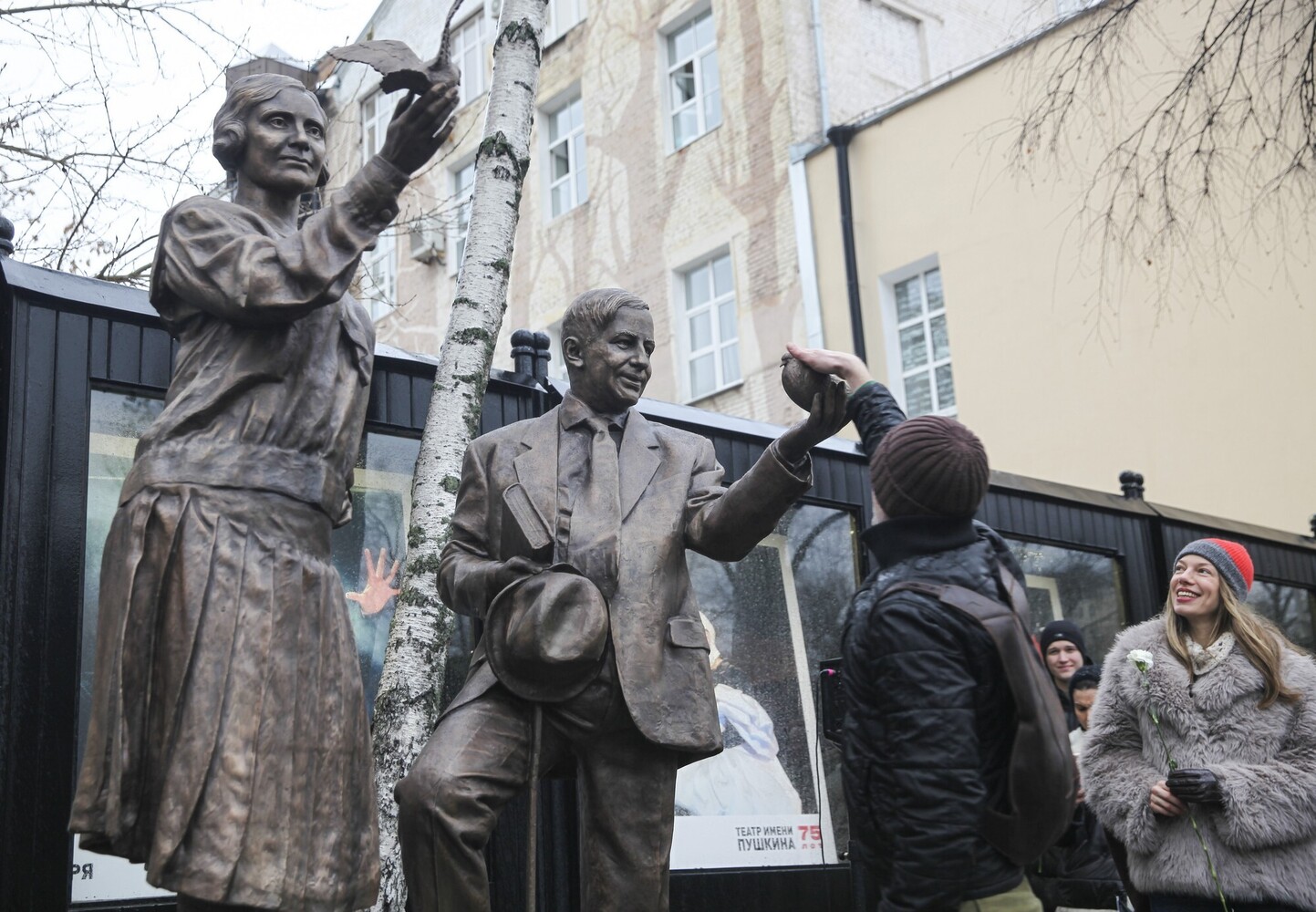 В понедельник в полдень возле театра им. Пушкина открыли памятник великому режиссеру Александру Таирову и его музе , легендарной трагической актрисе Алисе Коонен. Несмотря на проливной дождь на открытие пришло многу народу - артисты Пушкинского, худруки и директора многих театров. Собравшиеся оценили великолепную скульптурную композицию работы Филиппа Трушина -, красивая пара с птицами в руках застыла в бронзе возле театра, который они создали 110 лет надад и откуда они несправедливо были изгнаны в 1949 году. И вот справедливость восторжествовала - Таиров и Коонен вернулись.