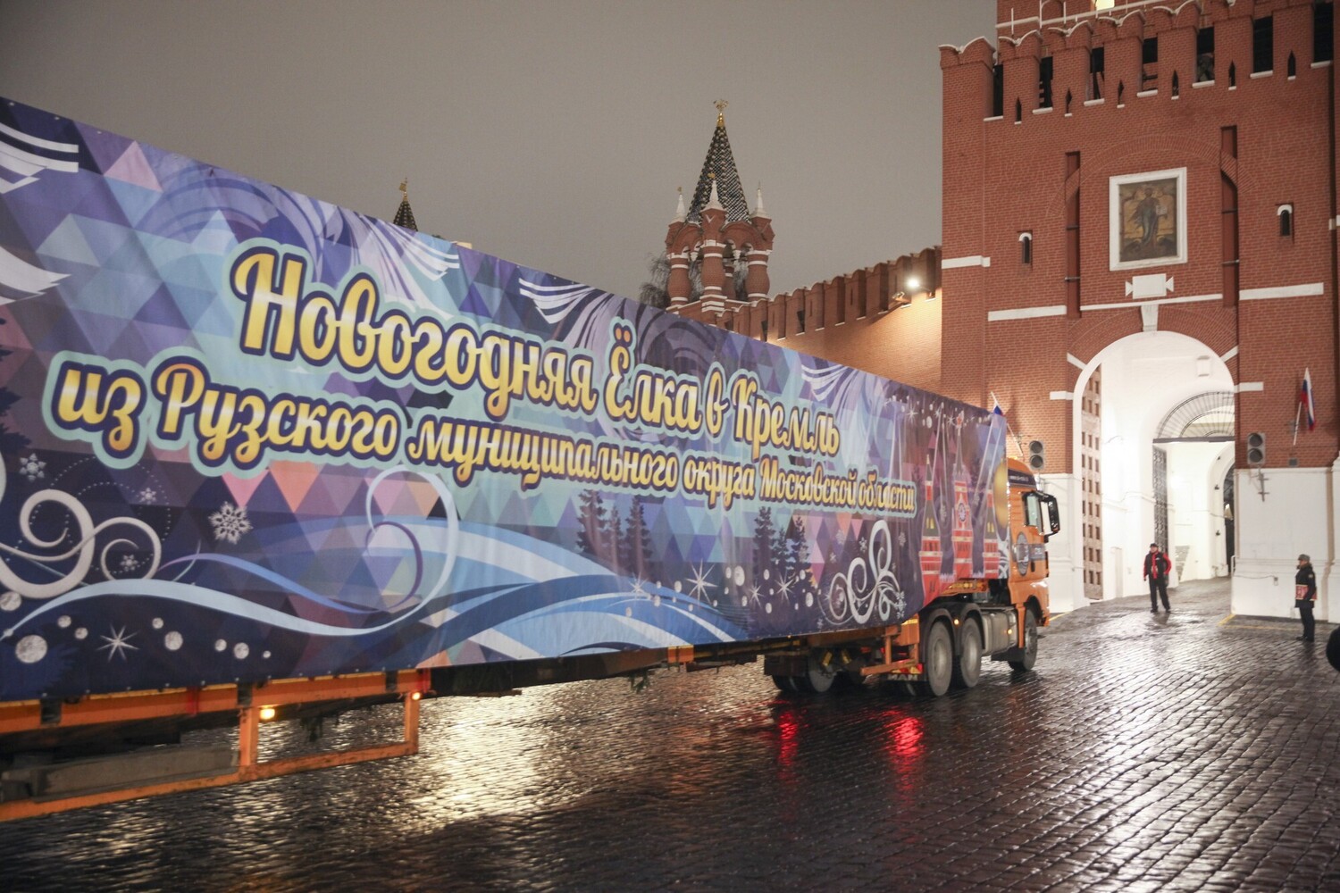 Автопоезд с елкой заехал на территорию Кремля через Спасские ворота под бой курантов в 22:00. За рулем находился Дед Мороз, который сообщил, что дерево доставлено в целости и сохранности. Елка была найдена в Рузском муниципальном округе рядом с д. Землино. Ее высота — 26 метров, обхват ствола — 64 сантиметра, размах нижних ветвей 11 метров. Возраст дерева, которое украсит сердце столицы, — ровно 100 лет.