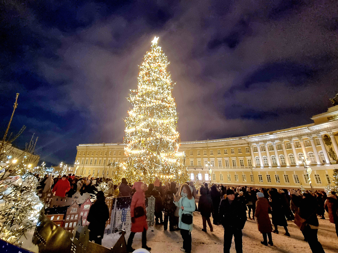 При этом основные толпы гуляющих традиционно сосредоточены на Невском и на Дворцовой площади, где красуется главная новогодняя ёлка Санкт-Петербурга - 30-ти метровая ель.