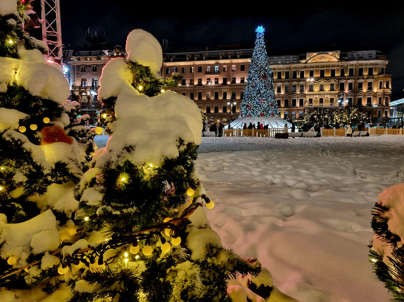 При этом основные толпы гуляющих традиционно сосредоточены на Невском и на Дворцовой площади, где красуется главная новогодняя ёлка Санкт-Петербурга - 30-ти метровая ель.