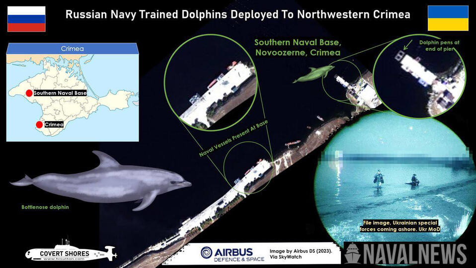 Якобы вольеры с дельфинами замечены на военно-морской базе в поселке Новоозерное. Как пишут, украинские «военные эксперты», боевые дельфины считаются эффективным оружием против военных водолазов и морских диверсантов.