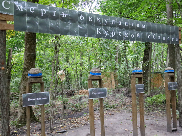 Помню, раньше в каждом военном городке «политруки» вешали плакат, отражающий боевой путь части. Офицеры 56-го гвардейского полка ВДВ военно-политическую работу с бойцами проводят, не отвлекаясь от боевых действий. В пункте временной дислокации штурмовой роты – таблички с названием населенных пунктов Курского, а теперь уже Сумского приграничья. Каждый освобожден потом и кровью этих десантников. А венчают композицию – трофейные каски тех, кто с мечом пришёл на нашу землю.