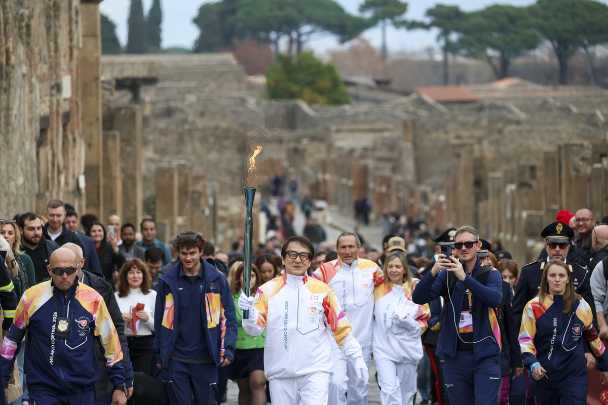Актер Джеки Чан принял участие в эстафете олимпийского огня. Он пронес факел по руинам города Помпеи в преддверии Олимпийских игр в Италии.