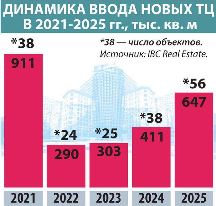 Как сообщила руководитель департамента исследований и аналитики компании IBC Real Estate Екатерина Ногай, в январе -- ноябре в РФ ввели в эксплуатацию 53 качественных торговых объекта, до конца этого года к открытию ожидается еще 3 торговых центра. При условии запуска всех запланированных объектов совокупный объем ввода по итогам 2025 года составит 647 тыс. кв. м, что в 1,6 раза превысит показатель прошлого года. Результат станет максимальным за последние четыре года по площади. Рекордным по площади пока остается 2021 год, когда в эксплуатацию было введено 911 тыс. кв. м.
