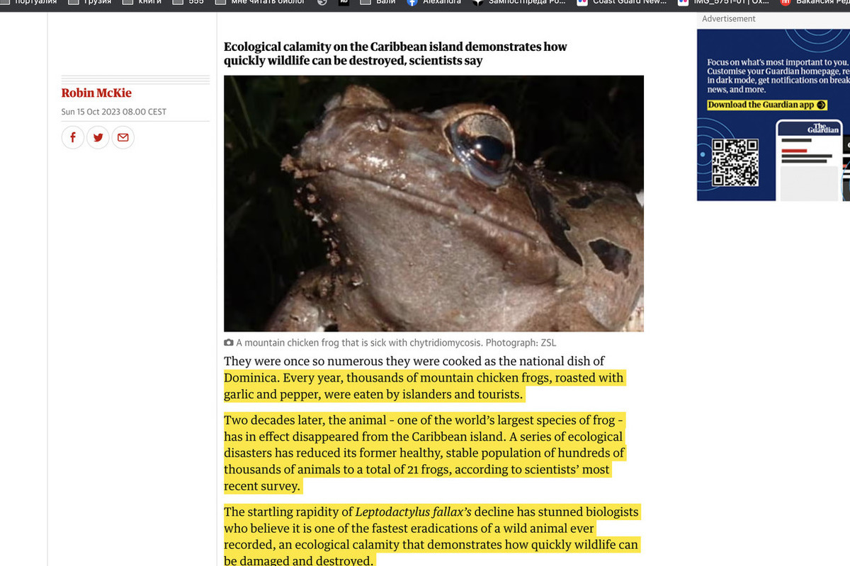 «Это удивительное животное», — сказал Эндрю Каннингем, руководитель отдела эпидемиологии дикой природы Лондонского зоологического общества (ZSL). «Он может вырасти примерно до 20 см в длину и весить более килограмма. И самцы, и самки играют важную роль в воспитании детенышей, и это был один из главных хищников Доминики, который ел насекомых, мелких млекопитающих, змей и других лягушек». Об этом пишет The Guardian.