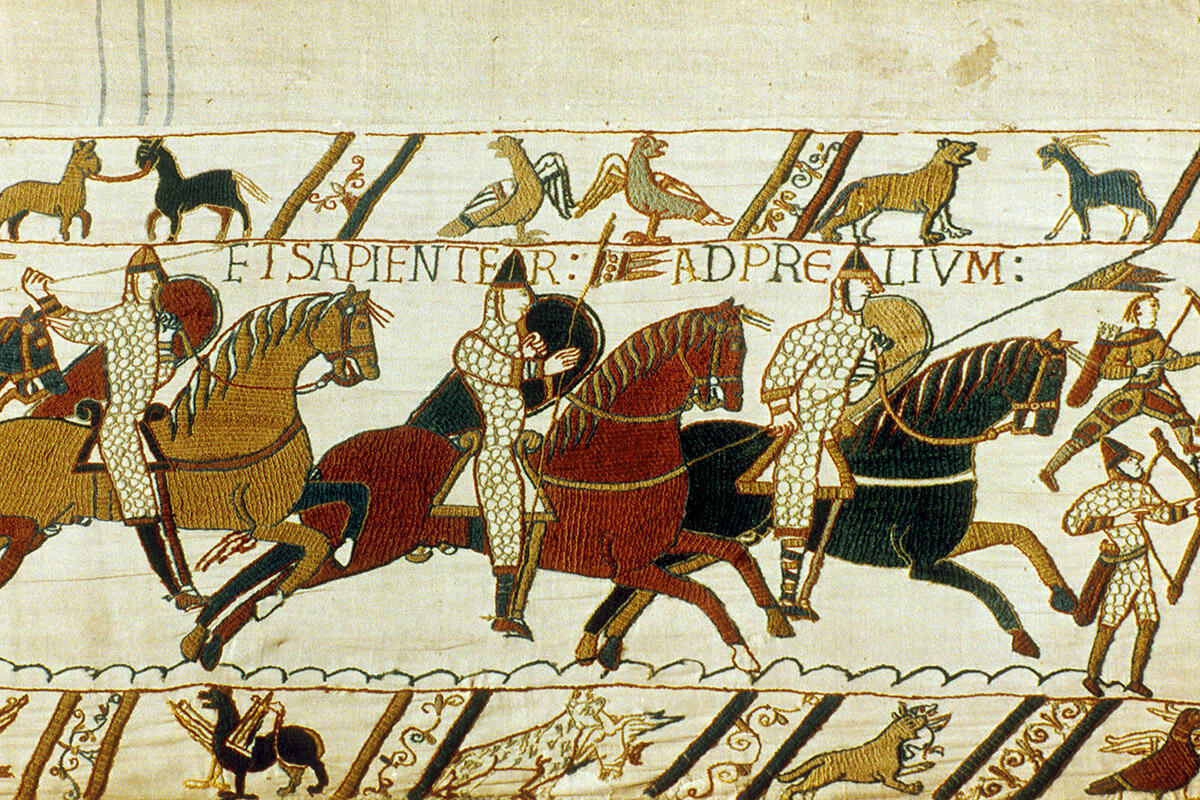 На гобелене длиной 68,3 метра изображен Вильгельм, герцог Нормандский, и его армия, убивающие Гарольда Годвинсона, или Гарольда II, последнего англосаксонского короля Англии, в битве при Гастингсе. Хотя изображение Гарольда, вытаскивающего стрелу из глаза, на вышивке может быть предметом споров, команда археологов утверждает, что оно подтвердило другую деталь, отличную от сцен на гобеленах Гарольда: местоположение его резиденции в Бошеме в Англии.