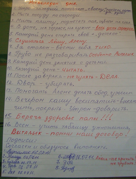 Большое семейство как может старается поддерживать порядок: полы чисто вымыты, кровати аккуратно заправлены. Обязанности между детьми распределены строго. На стене висит напоминание: «Мыть посуду по очереди», «Мыть плиту, подметать пол», «После завтрака не гулять — дела», «Двор — убирать», «Каждый день стирать свое + детское»...