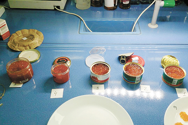 Рыбная витрина выглядела просто замечательно, на небольших кусочках льда лежала разная снедь, так и призывающая взять да запечь себя в духовке под розмарином. Но самое почетное место в этом отделе занимала не носатая осетрина, а крохотные баночки, большая часть из которых по 140 граммов, с красной икрой. Подозвав продавца, я озвучила свое желание закупиться достоянием нашего дальневосточного побережья и после того, как корзинка наполнилась разноцветными упаковками, отправилась на кассу. Счет вышел весьма внушительный — около 12 тысяч рублей. В итоге в свою сумку-холодильник я загрузила лососевую икру следующих фирм: «ЮГРА» (704 руб. за 100 г) — назовем ее образец №1, «СИК» (713 руб. за 100 г) — образец №2, «Просто Азбука» (469 руб. за 100 г) — образец №3, «Корсаков» (664 руб. за 100 г) — образец №4 и «Красное золото» (520 руб. за 100 г) — образец №5. А уже через пятнадцать минут сдала все сие богатство экспертам.