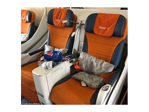 Распластавшись по-королевски на своем месте, журналистка «Дэйли Мэйл» сделала фотографию вытянутых ног, обутых в тапочки на фоне встроенного в переднее сиденье телевизора, экран которого составляет 15,4 дюйма. Понравились англичанке и кресла, которые по нажатию одной кнопки раскладываются в удобную кровать длиной 190 см, «которая дарит возможность пассажиру прекрасно выспаться».