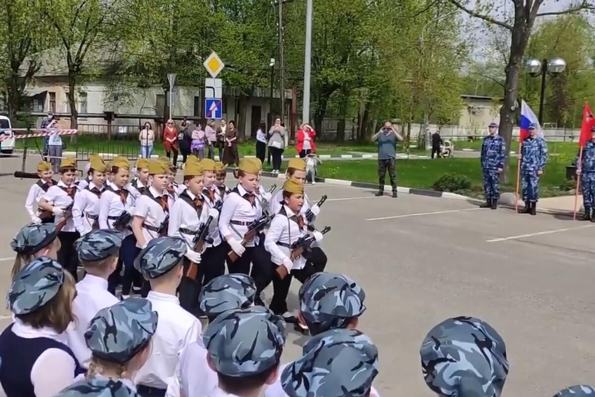 В Электростали в Московской области во всеволодской школе №42 прошел смотр строя и песни, в ходе которого третьеклассники маршировали в пилотках, белых рубашках и черных брюках с макетами автомата в руках.
