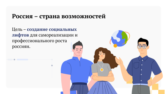 Ее основная цель – создание социальных лифтов, чтобы россияне могли самореализоваться, найти себя, личностно и профессионально расти.