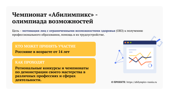 В переводе с английского «абилимпикс» означает «олимпиада возможностей». «Абилимпикс» – это международное некоммерческое движение, которое развивается в мире с 1971 года. Наша страна присоединилась к нему в 2014 году. Сейчас в международном движении принимает участие 52 страны мира. С 2015 года в России проводится чемпионат «Абилимпикс», основная цель которого – обеспечение эффективной профориентации и мотивации инвалидов и лиц с ограниченными возможностями здоровья (ОВЗ) к получению профессионального образования, а также помощь в трудоустройстве и социокультурной инклюзии в обществе.